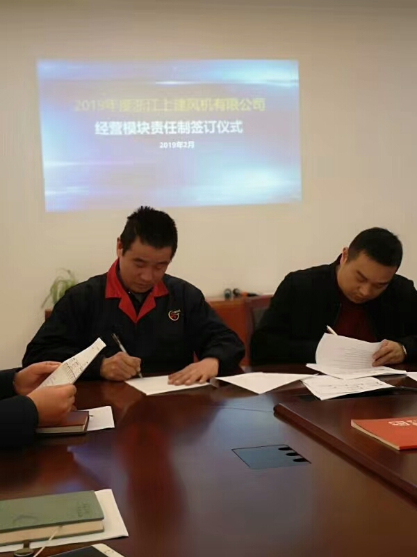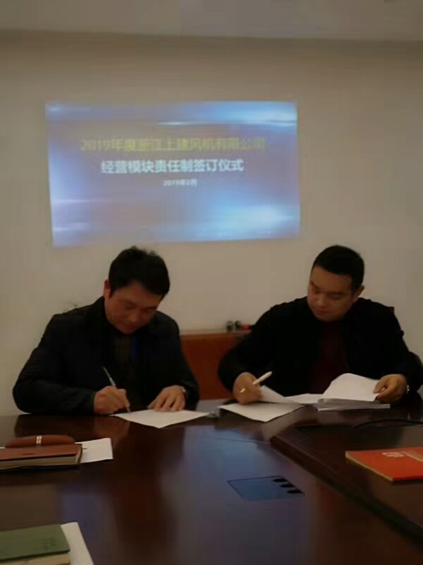 2019年2月28日,浙江上建風(fēng)機(jī)有限公司經(jīng)營(yíng)目標(biāo)責(zé)任狀簽訂儀式在公司1號(hào)會(huì)議室舉行。公司總經(jīng)理童海標(biāo)、各經(jīng)營(yíng)部門負(fù)責(zé)人、職能部門負(fù)責(zé)人參加簽訂儀式。