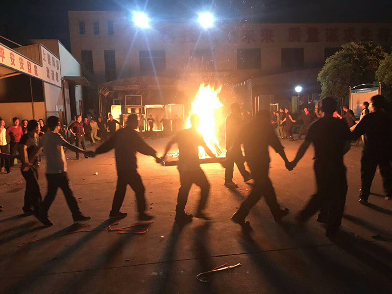 最讓人激動人心的篝火晚會隨著“皇后大道東、兔子舞”等活潑愉快的旋律拉開帷幕,濃烈而又跳躍的篝火在上建的土地上猛烈的燃燒著,隨風(fēng)而舞的火苗竄上上建的天空,旺啊!燒。T工們個個向火堆投木柴,眾人拾柴火焰高。大家手拉著手,手搭著肩,圍成一圏盡情歡快的跳著兔子舞,此時沒有老板、沒有領(lǐng)導(dǎo),大家是和諧共處的一家人,喜悅和興奮之情溢于言表。
