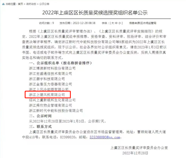 2022年12月,2022年上虞區(qū)區(qū)長質(zhì)量獎(jiǎng)候選授獎(jiǎng)企業(yè)名單公示結(jié)果顯示,上建風(fēng)機(jī)榮登榜單,獲得2022年上虞區(qū)區(qū)長質(zhì)量獎(jiǎng)候選授獎(jiǎng)。