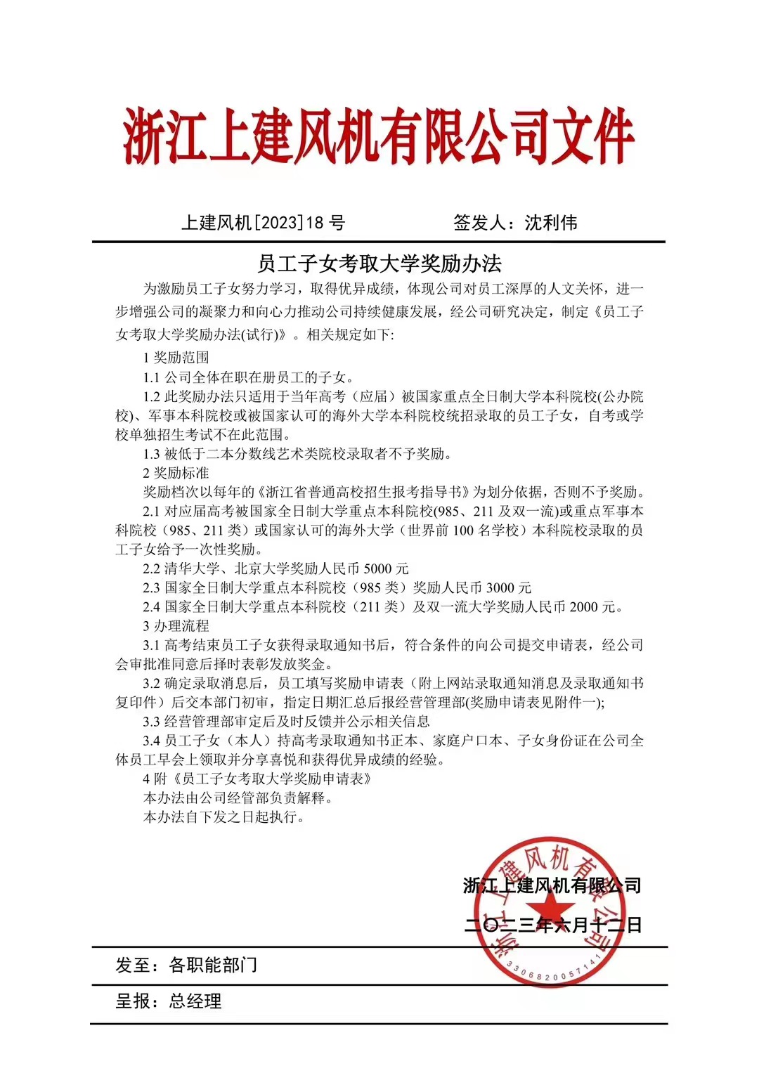 天地人和、潤澤萬物、以人為本為鼓勵上建職工子女勤奮學習、努力成才,在職工中形成關注子女成長教育的良好風尚。同時增強職工的向心力與歸屬感,彰顯上建天地人和、潤澤萬物、以人為本的經(jīng)營理念。今年起公司將對公司在職員工子女金榜題名、考取功名時給予一定的物資獎勵。祝愿所有上建職工子女勤勉刻苦、求知若渴、回報家庭與社會,祝愿你們在求學道路上自立自強,不負韶華、未來可期!