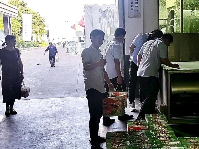 一個個芳香四溢、晶瑩圓潤的桃子,被仔細地放在盒子里。每位員工都可領(lǐng)取一盒,每一盒都彰示著公司對忠誠奉獻上建人的滿滿心意與愛意。